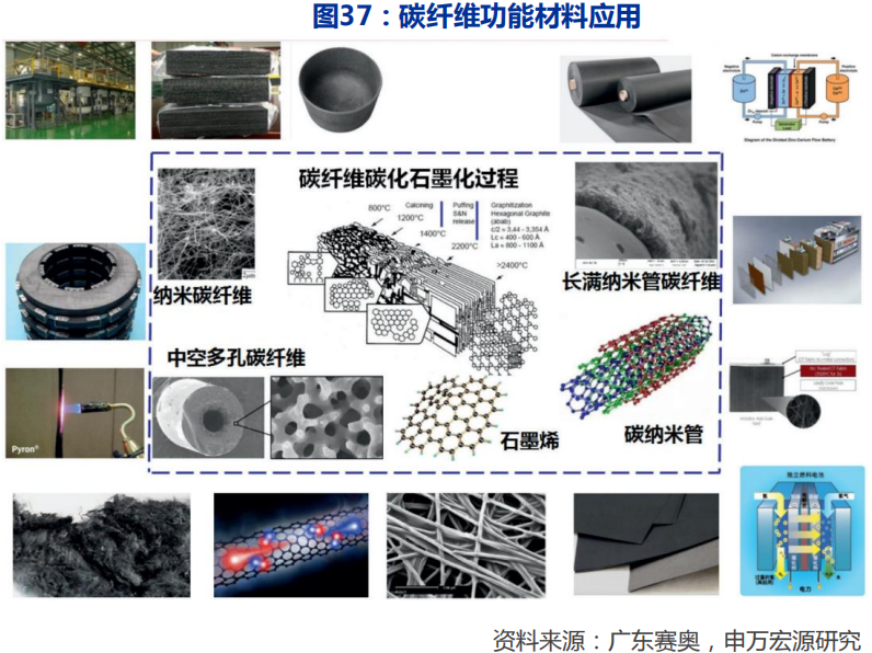 新型的碳纤维功能材料主要有:1)燃料电池的气态扩散层(GDL);2)液流电池的电极材料的碳毡(石墨毡);3)替代铅酸电池的铅板电极的碳毡板;4)替代锂离子电池的能量密度的多微孔碳纤维材料;5)预氧毡+二氧化硅气凝胶制备的阻燃、静音、疏水、保温的多功能材料,可用于电动车电池之间的隔离、可用于各类功能建筑、也可用于潜艇、坦克等的静音材料……