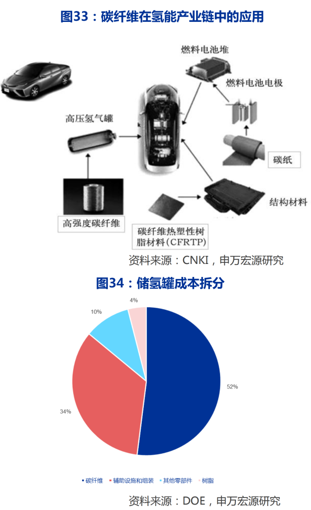 碳纤维是储氢罐最为主要的材料,据美国DOE数据,储氢罐成本占比超过50%,乘用车储氢罐单车用量为75kg,商用车储氢罐单车用量为320kg,结 合《中 国 氢 能 产 业 发 展 报 告2020》,2025/2030氢 燃 料电 池 汽 车10/100万辆的规划,我们测算得出2025/2030年我国储氢罐用碳纤维需求量可达1.62/9.43万吨。据《2020全球碳纤维复合材料市场报告》,全球范围内压力容器碳纤维需求2025/2030年可达2.19/18万吨。