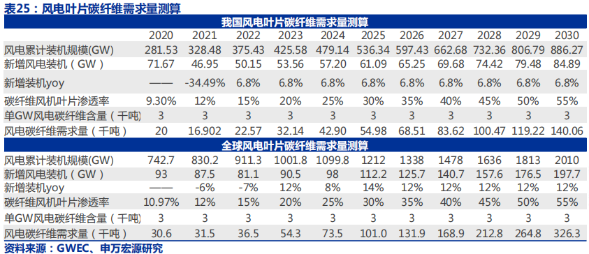 维斯塔斯22年7月专利到期,GE、Siemens以及国内厂商放量确定,25年前行业规模有望扩3倍以上;这部分需求增量国内主要由吉林碳谷、光威内蒙古、新创碳谷等大丝束集群满足,但海外新增需求可能部分由海外供应商扩产满足。